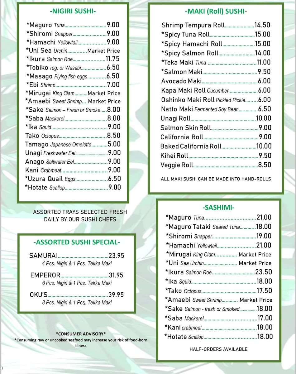 Welcome to Okus Sushi Kihei, where authentic flavors of Japan come alive. Nestled in the heart of Kihei, this charming eatery offers an impressive menu that captures the essence of traditional sushi. Guests can indulge in a variety of fresh salads like Sunomono starting at just US$3.50, or delight in expertly crafted sushi rolls such as the Shrimp Tempura Roll for US$14.50.